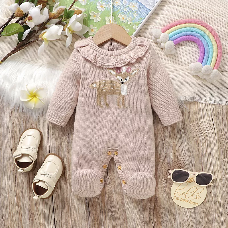 Baby Deer Knit Romper – Soft Infant Jumpsuit with Ruffles & Foot Wrap (0-9M)