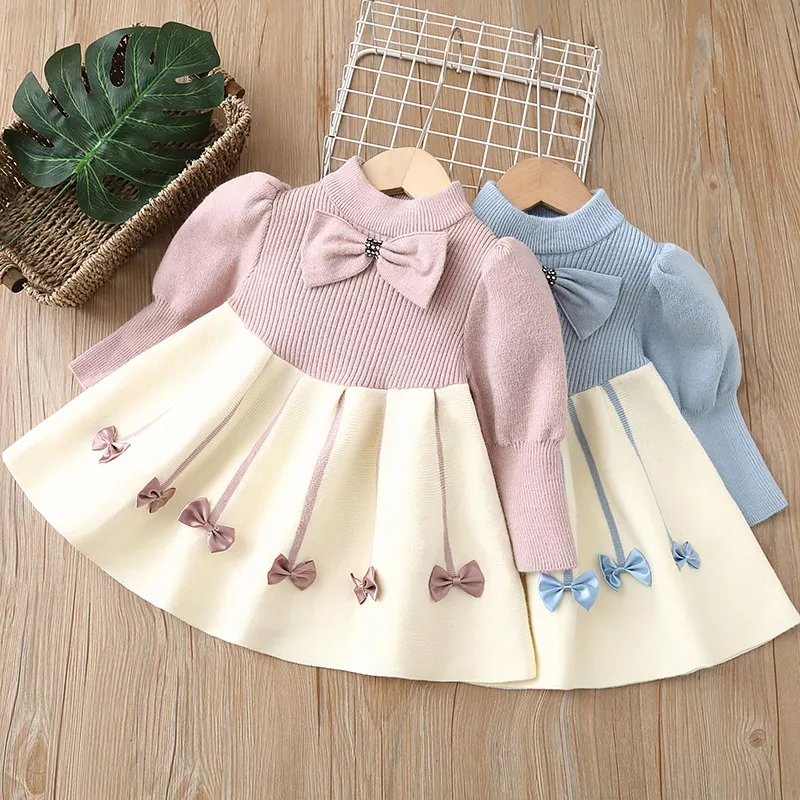 Winter Knit Baby Girl Dress with Bow – Long Sleeve Warm A-Line Outfit